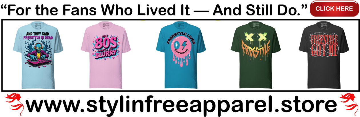 Last but certainly not least, our Stylin’ Free Apparel Store is Open for Business, with over 200 tees designed specifically for you die-hard Freestyle fans. Go on in and take a look around, and if you see something you like, grab it! Rock one at your next Freestyle event and represent the Freestyle culture in style!