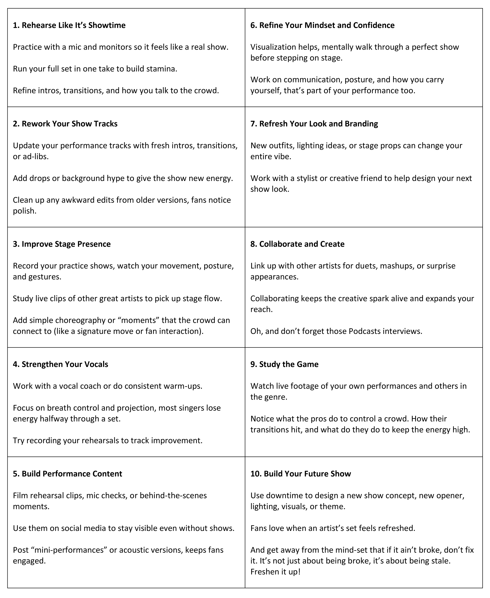 Well, I say, use it as a reset period. Take some time to reflect on your recent shows. Keep a notebook handy and write down what worked well, those moments that connected with the crowd, the ideas that landed, the routines that clicked. Can those be polished or expanded?