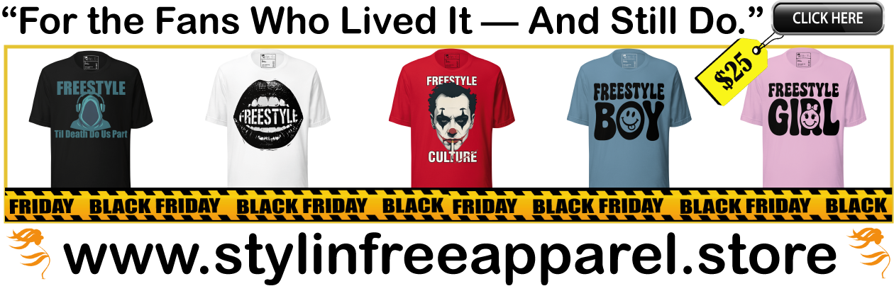 Before you go, make sure and swing by our Stylin’ Free Appeal online store. We’ve got over 250 Freestyle-inspired tees on an Early Black Friday Sale, all created for those who live and love this music as much as we do. Don’t forget, Christmas is right around the corner folks, as well as a new year’s worth of Freestyle events bound to head your way… so order today!